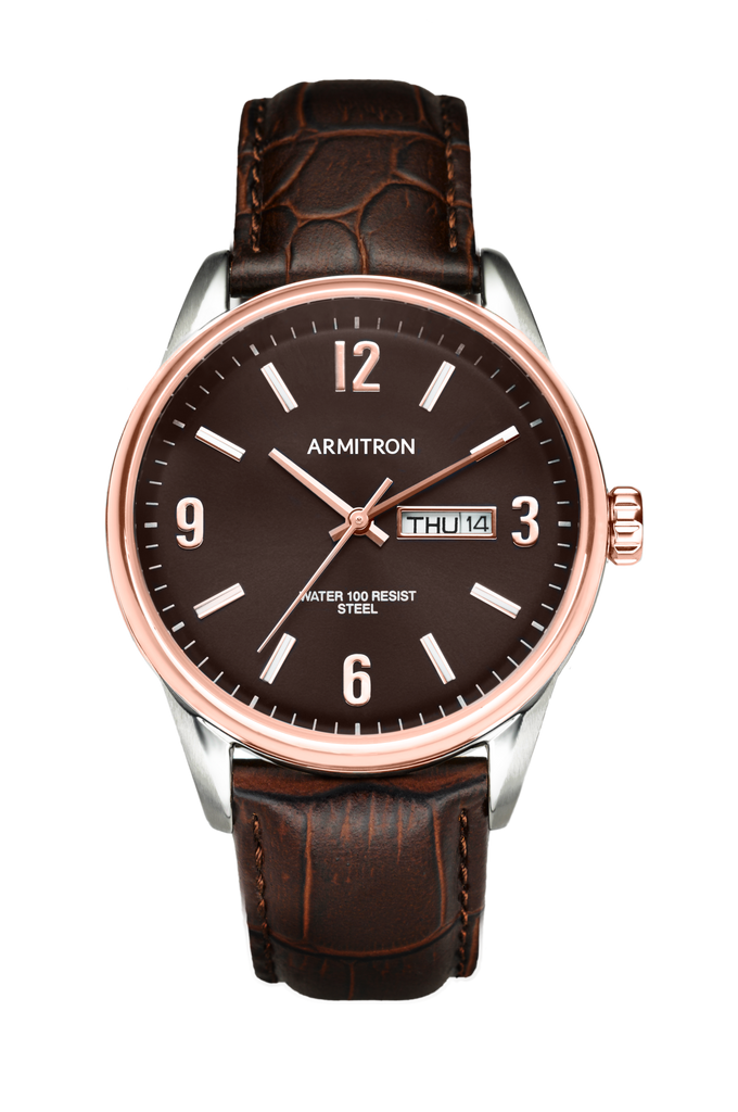 Brown croco-grain leather strap with stainless steel buckle closure.